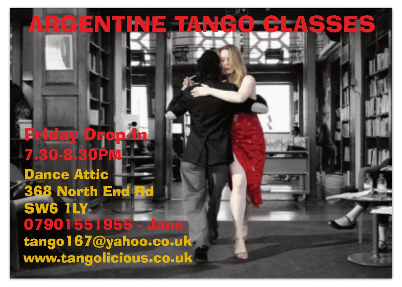 Tango Drop-In – Friday 20th August August 20, 2021 by tango167 Tonight at Dance Attic! 7.30-8.30pm General Level Class with Jane Beginners welcome! £8 payable after the class (+£2 entry at reception) 368 North End Road, SW6 1LY (opposite St. John’s Church) Nearest Tubes: Fulham Broadway & West Brompton Share this:Share Click to email a link to a friend (Opens in new window) Email Click to share on Facebook (Opens in new window) Facebook Click to share on X (Opens in new window) X Click to print (Opens in new window) Print Click to share on Pinterest (Opens in new window) Pinterest Click to share on Tumblr (Opens in new window) Tumblr Like Loading...