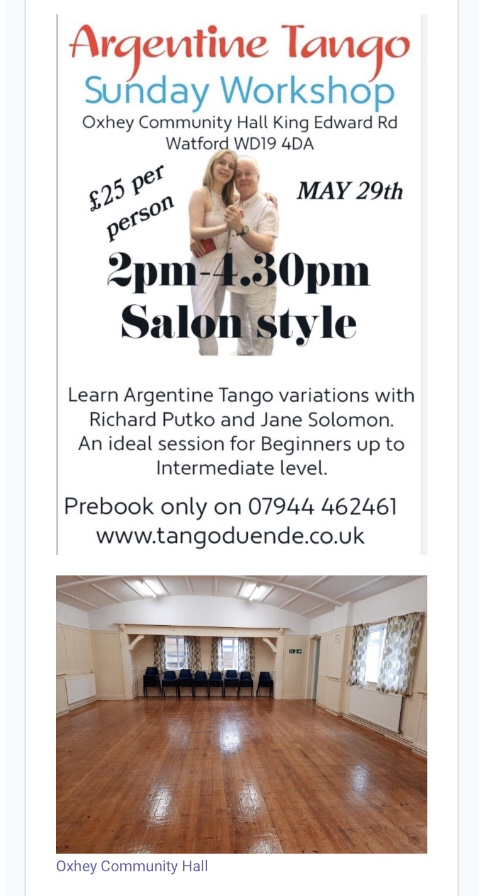 I’m delighted to be invited by Richard Putko to teach another Argentine Tango Workshop with him on Sunday 29th May at Oxhey Community Hall.