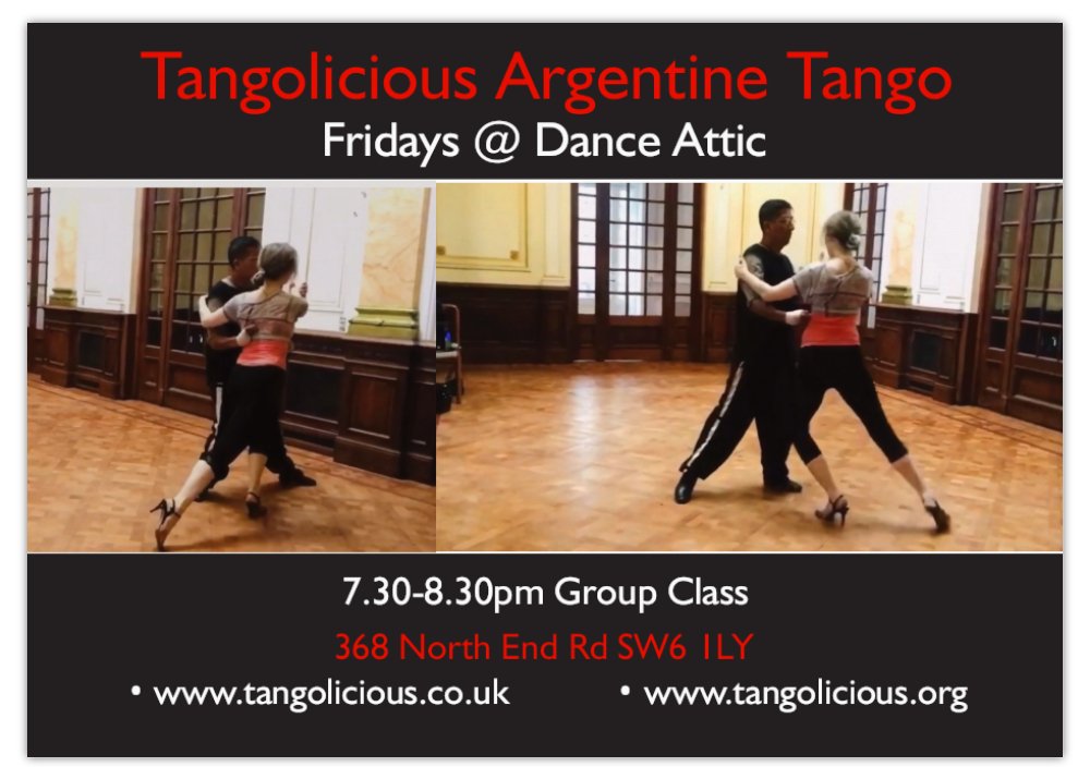 Next Tango Class Friday 3rd November @ Dance Attic! October 30, 2023 by tango167 Where: Dance Attic 368 North End Rd SW6 1LY When: 7.30-8.30pm Cost: £10 (plus £2 at reception) Info: tango167@yahoo.co.uk /07901551955 (Jane) No need to book or come with a partner All welcome! Share this:Share Click to email a link to a friend (Opens in new window) Email Click to share on Facebook (Opens in new window) Facebook Click to share on X (Opens in new window) X Click to print (Opens in new window) Print Click to share on Pinterest (Opens in new window) Pinterest Click to share on Tumblr (Opens in new window) Tumblr Like Loading...