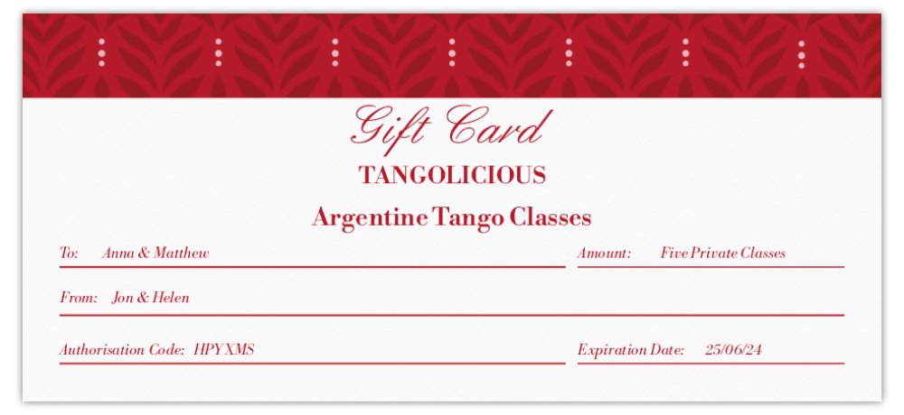 Tangolicious Argentine Tango Gift Cards make a great present for any occasion, available from as little as £60, the cost of a single one hour private lesson (individual or couple)